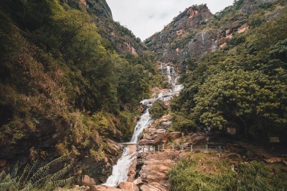 In the misty mountains of tropical Sri Lanka, the wide Ravana falls gushes down a height of 82 feet falling from an oval concave rock. It takes the form of a drooping areca flower during the peak season of its water flow, but its size is reduced dramatically during the dry season. Located in the Ravana Ella Wildlife Sanctuary in Ella, this waterfall is the source of many legends and secrets.Landscapes around the Ravana falls comprises of slopes, valleys, hills and streams that ornament the rocks.